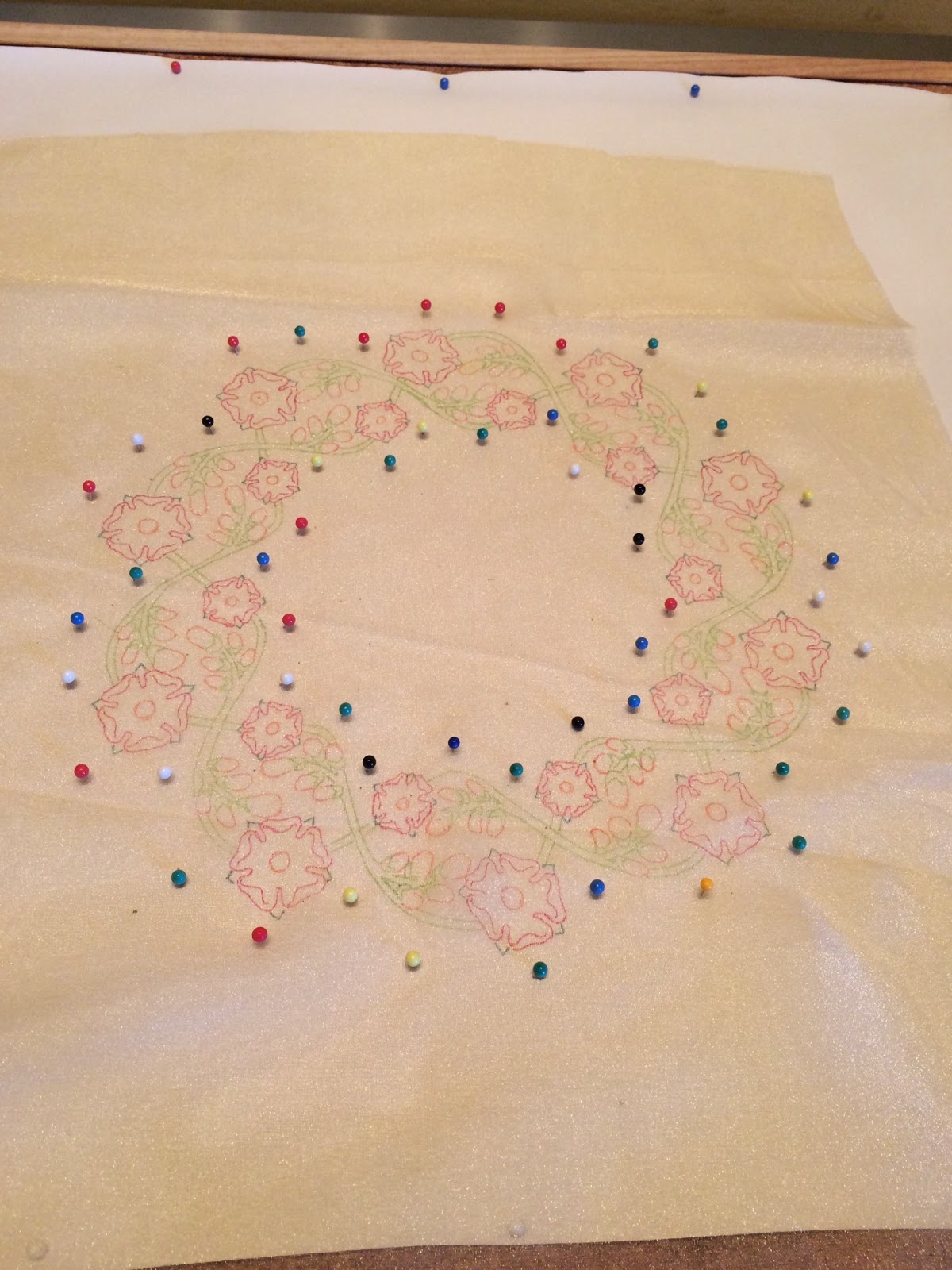 I'm going for a Yorkist version here so the roses are going to be white, but I need to be able to see the outline so I traced them in red as the finished embroidery will be appliquéd onto a dark red velvet. If I do a companion Lancastrian version then the roses will of course be red.